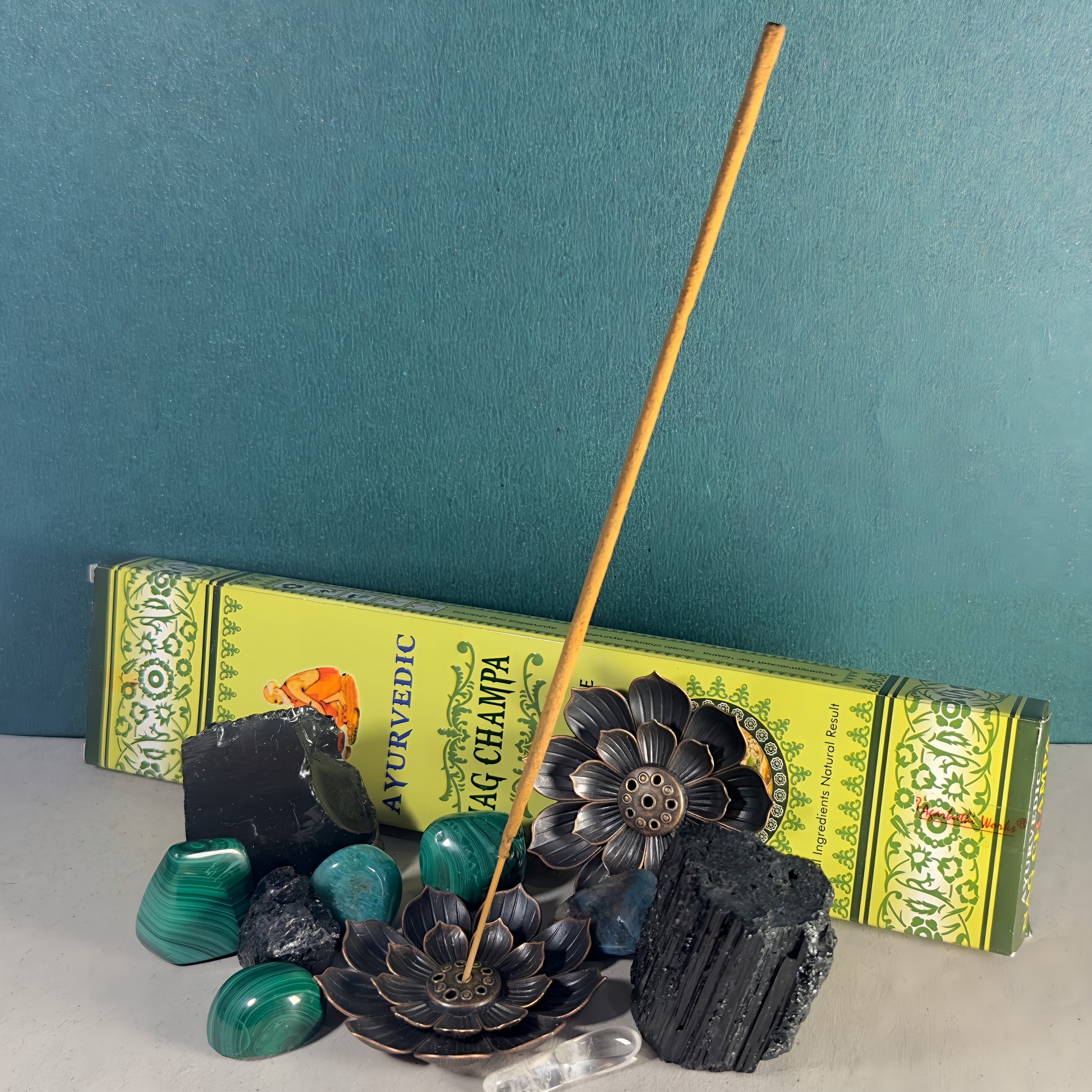 - 🧼 Nettoyage : Essuyez doucement avec un chiffon sec ou légèrement humide pour retirer les résidus d’encens. Évitez les produits abrasifs afin de préserver la teinte cuivrée.